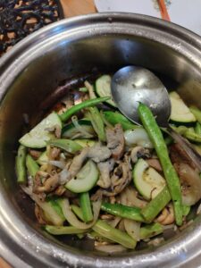 ニンニク、タマネギ、アメリカインゲン、ズッキーニ、シメジ。
